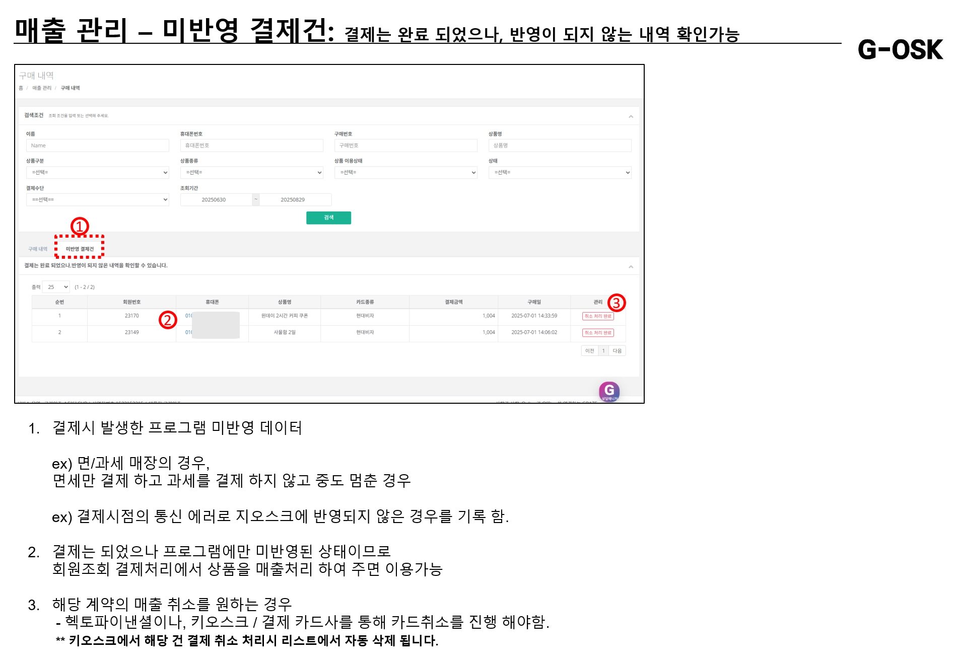 통신장애나, 카드사 결제 장애발생시 해당 내역을 확인 후 조치하시가 바랍니다.