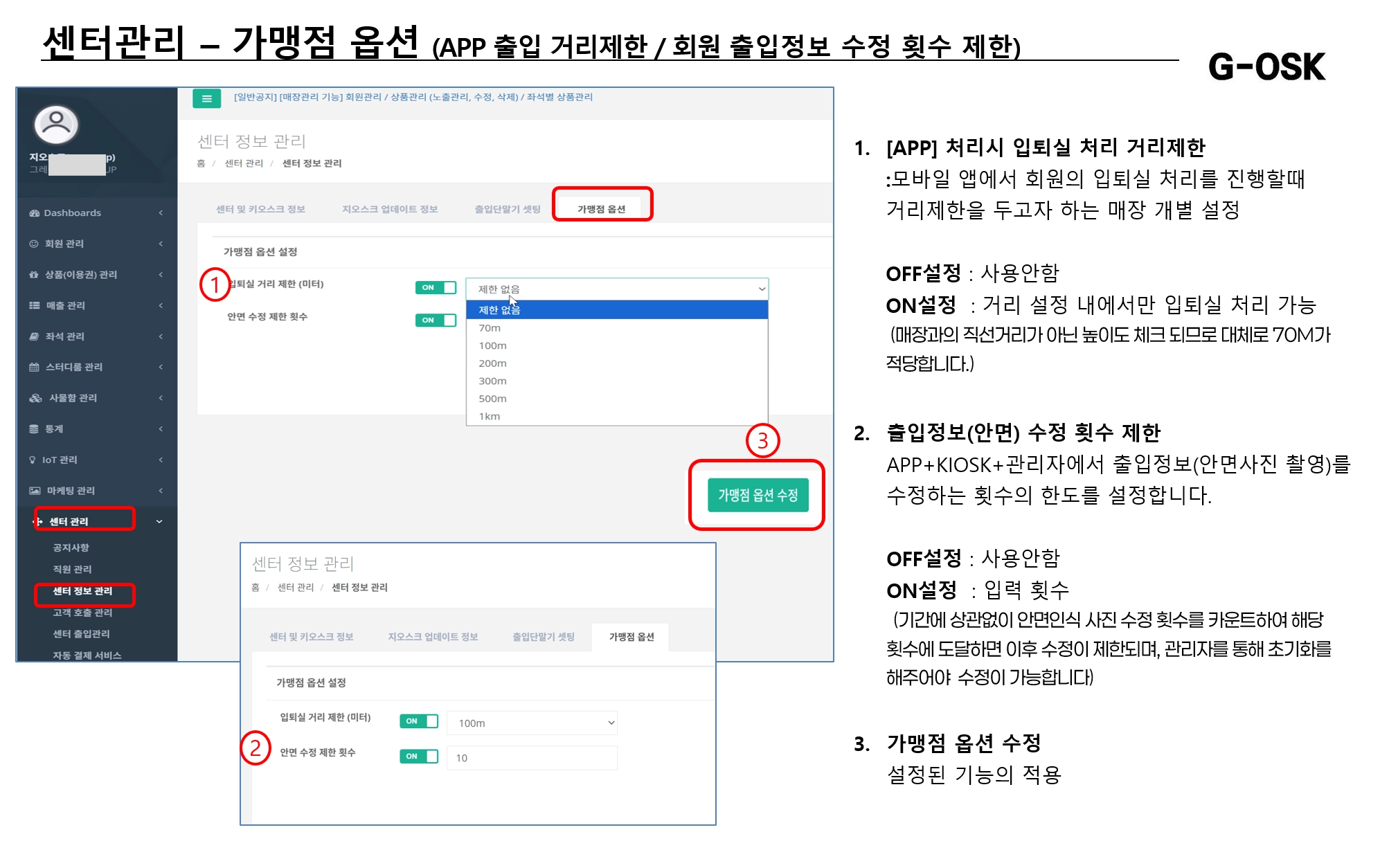 5. 센터관리 → 가맹점 옵션 1) APP출입 처리 거리제한 2) 회원 안면사진 촬영 수정 횟수 제한